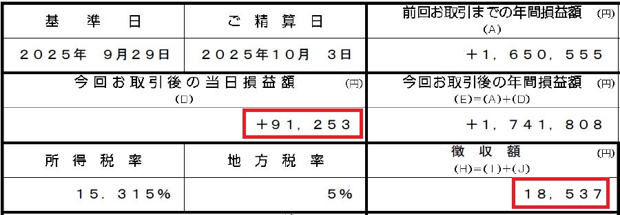 税引後の損益(手残り)は、72,680円(91,253円-18,537円)で、概ね予想通りとなりました。