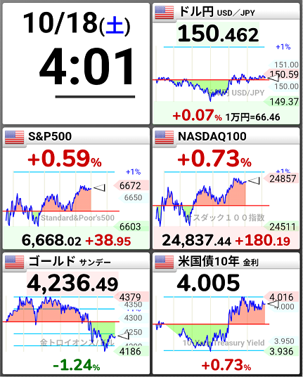 今朝の相場は週末ということもあり、金(ゴールド)や債券の利益確定売りが出ていますが、株価は上昇しています。