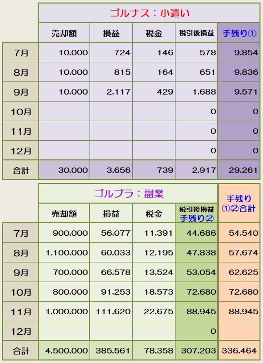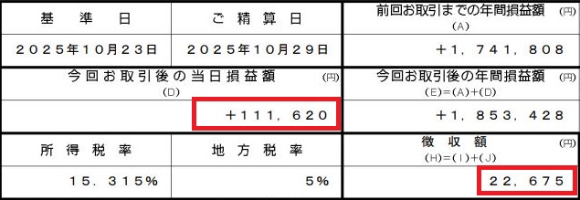 100万円分を売却して税引前損益が111,620円、税金22,675円、手残り(税引後損益)88,945円となりました。