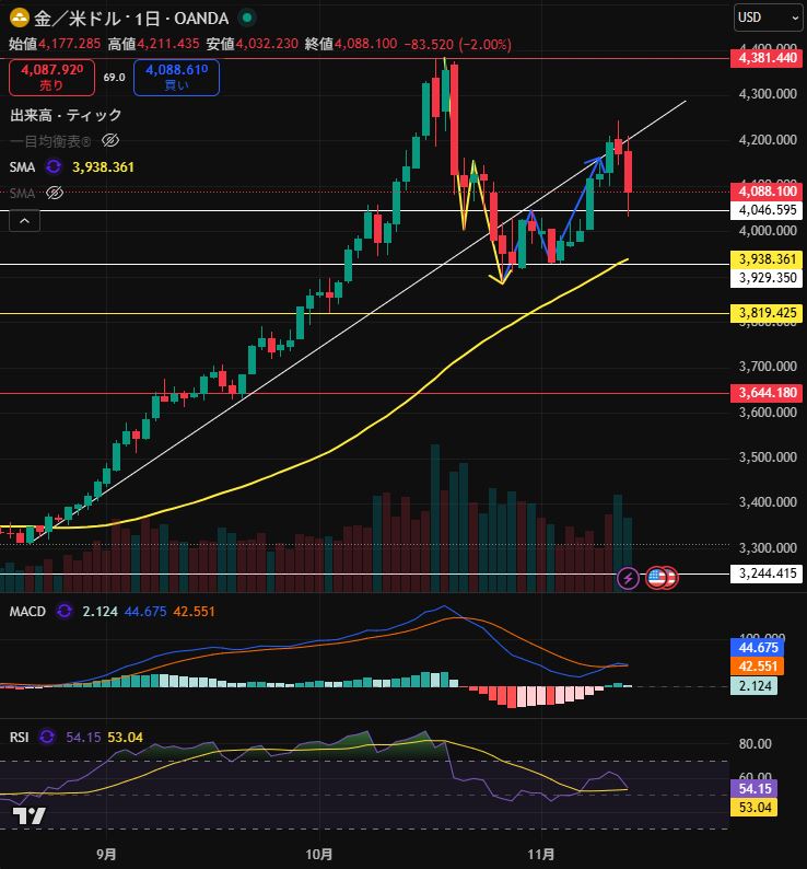 金(ゴールド)は、踏ん張りが効かず、下落してしまいました。