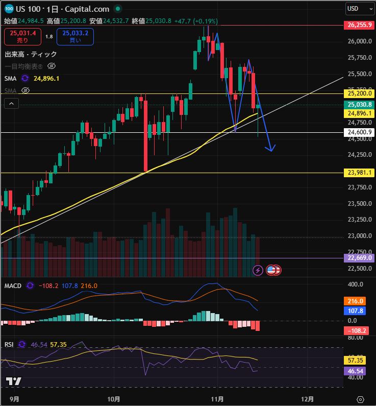 一方、NASDAQ100は前回安値を一瞬下回り、大きな下ひげを付け、かろうじて?50日移動平均線の上まで戻ってきています。