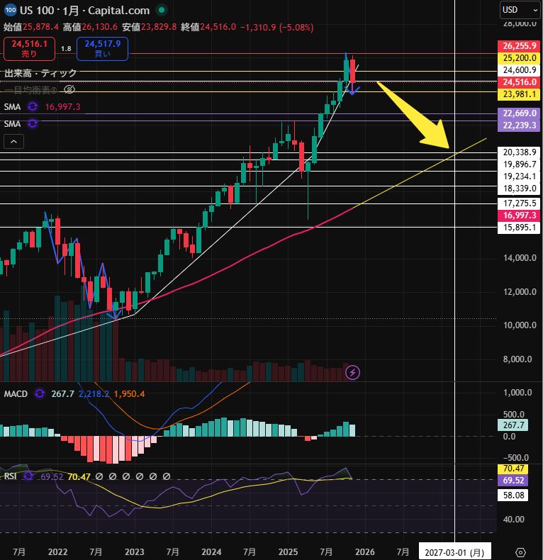 今後、米国の景気が不況に陥った場合、月足での調整が長引き、黄色矢印の辺りまでは調整する可能性が高いのではないかと考えられます。(2026年10月頃か、2027年3月頃までの調整)