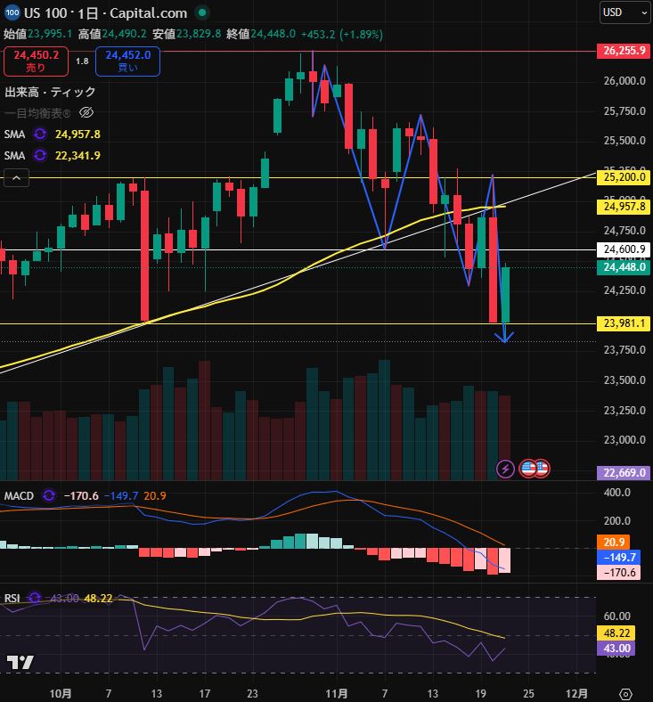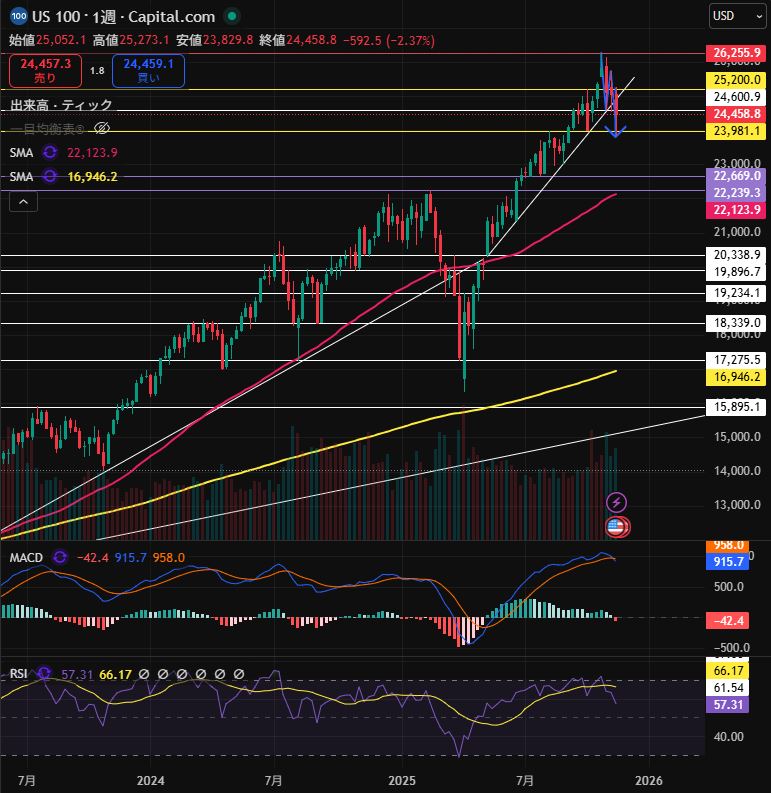 誠に残念ですが、NASDAQ100が週足での前回安値$23,981.1を下回り、ついに関税ショック以降続いていた上昇トレンドが終了してしまいました。