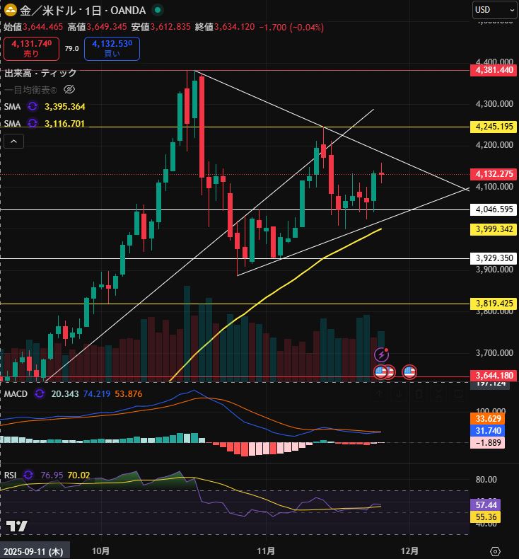 金(ゴールド)は、相変わらずの三角持ち合いです。
