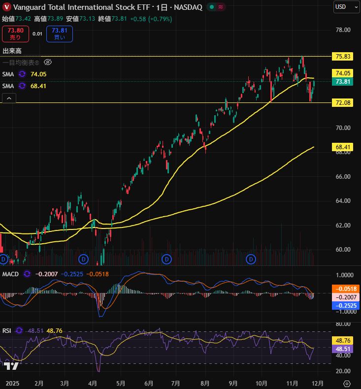 VXUS(全世界株式 除く米国)も50日移動平均線の下に位置しています。