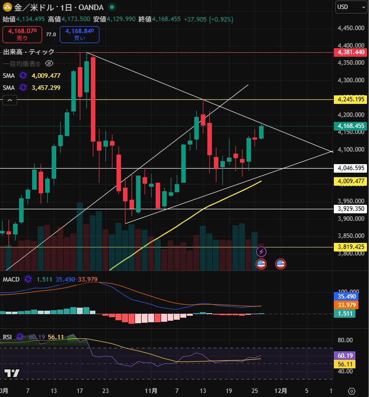 金(ゴールド)は、三角持ち合いの上値抵抗線まで上がってきました。