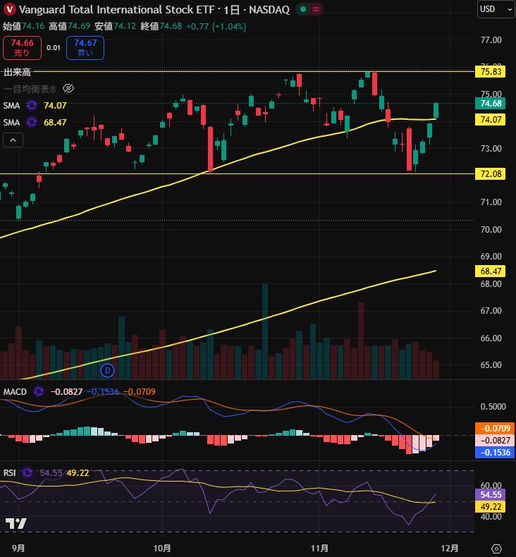 VXUS(全世界株式 除く米国)も50日移動平均線を超えてきました。