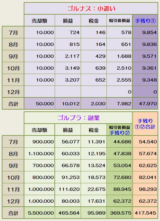 上記ゴルナスの計算結果を用いて、ゴルプラを計算するには差し引きすればいいだけなので、損益は80,003円、税金は17,631円手残りは62,372円となります。