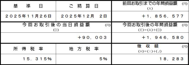 自動売却したのは10,000円なので損益は3,207円、税率は20.315%ですので納めた税金は652円と分かります。