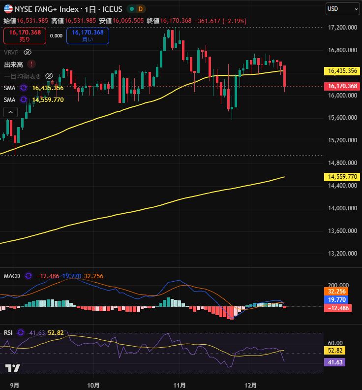 下落の大きいNASDAQ100ですが、特にFANG+が中心に売られているようで、FANG+は50日移動平均線を下に抜けてしまいました。