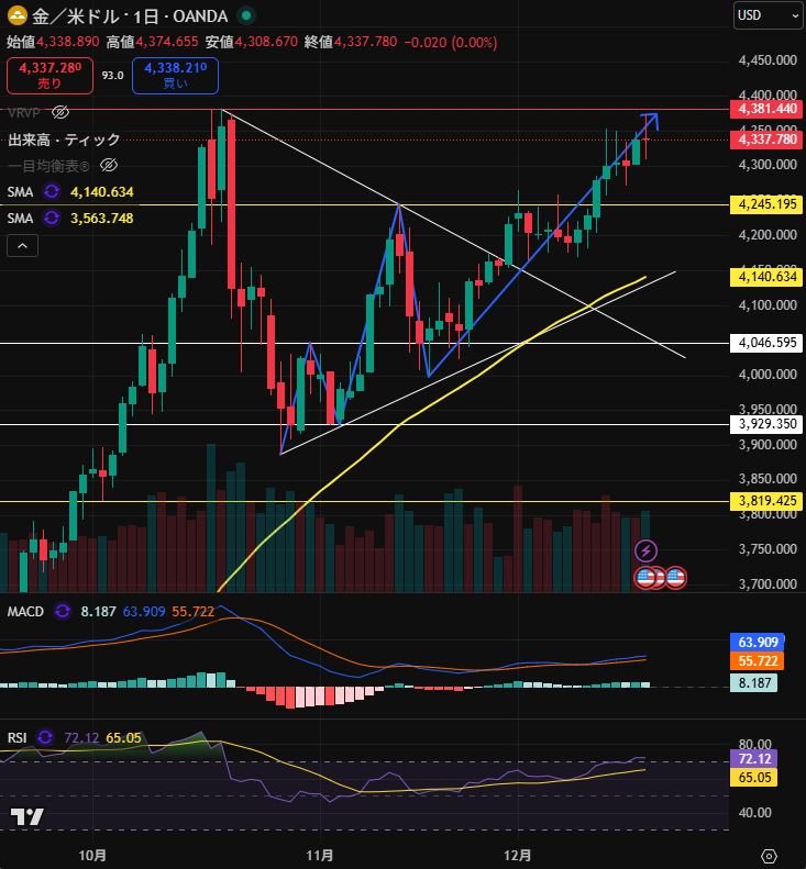 NASDAQ100は資金が抜けて下落、S&P500はセクターローテーションでマイルドな下落ですが、金(ゴールド)にしっかり支えられているという状況です。