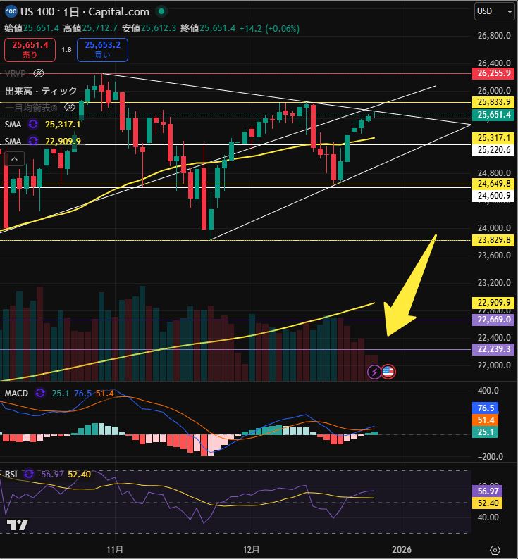 NASDAQ100は薄商いの中ですが、ようやく三角持ち合いの上値抵抗線にタッチしました。