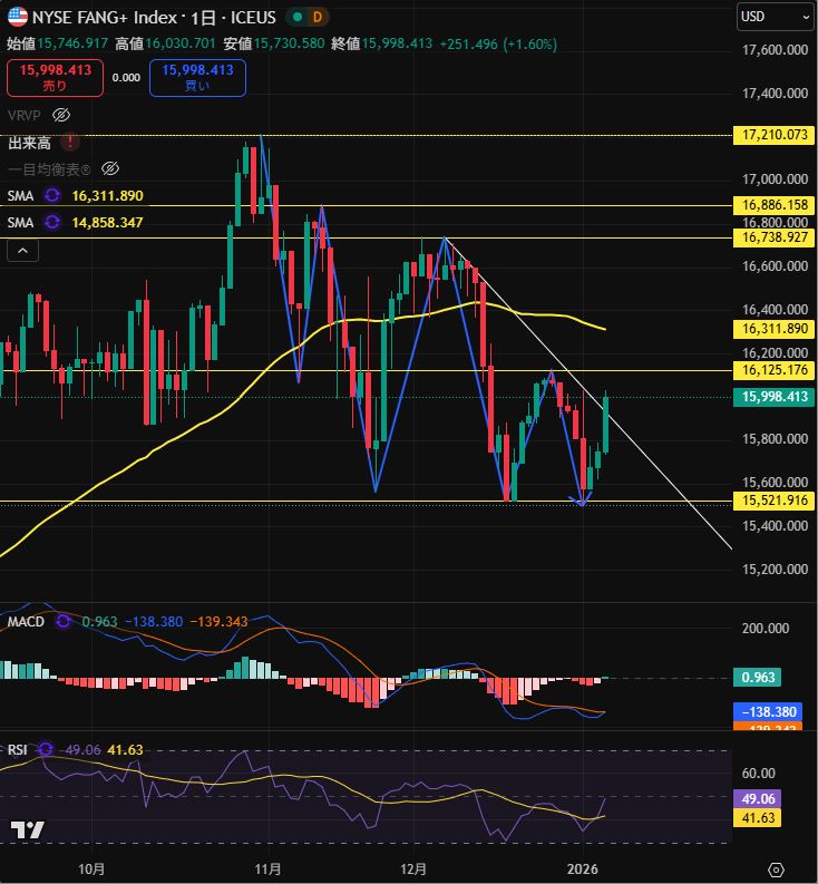 そして、FANG+もトリプルボトム(逆三尊)をつけて三角持ち合いを上にブレイクアウトしています。