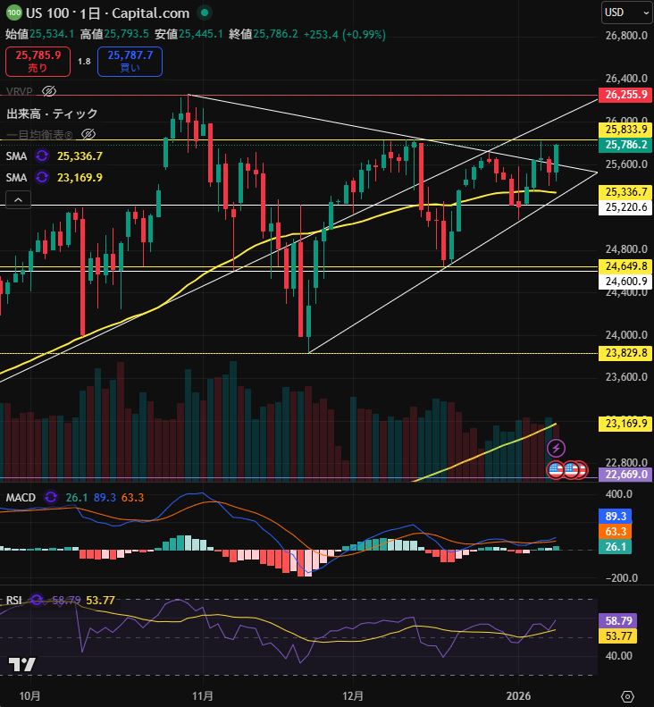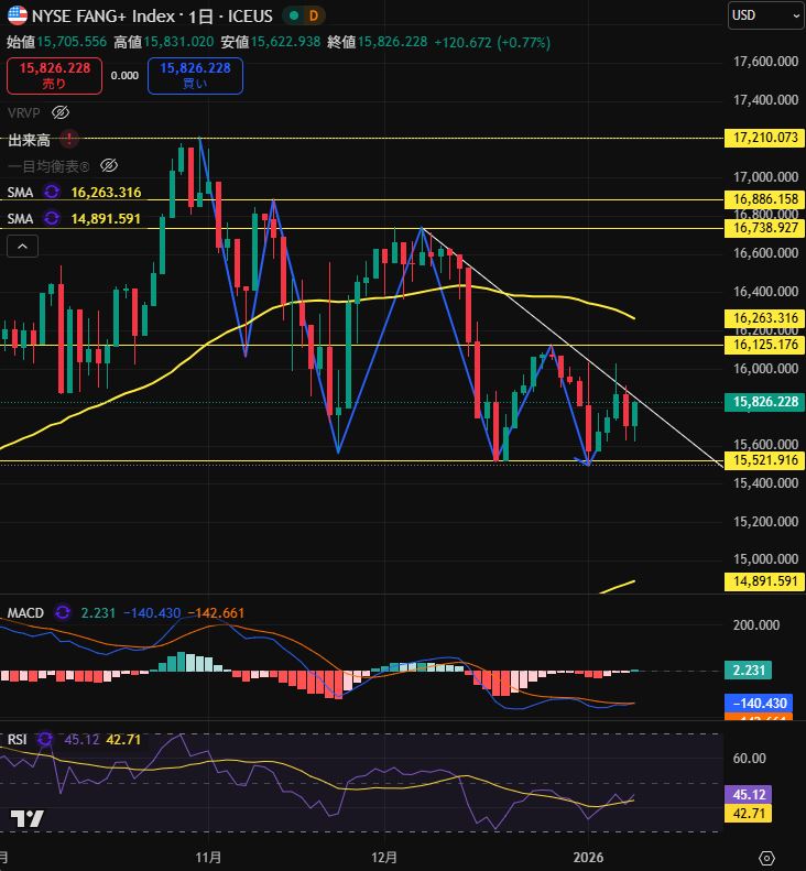 NASDAQ100は上昇してはいますが、前々回の高値を超えられずにいます。