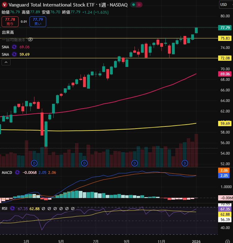 一方、資金は米国以外に向かっていてVXUS:全世界株式(除く米国)が史上最高値更新中です。