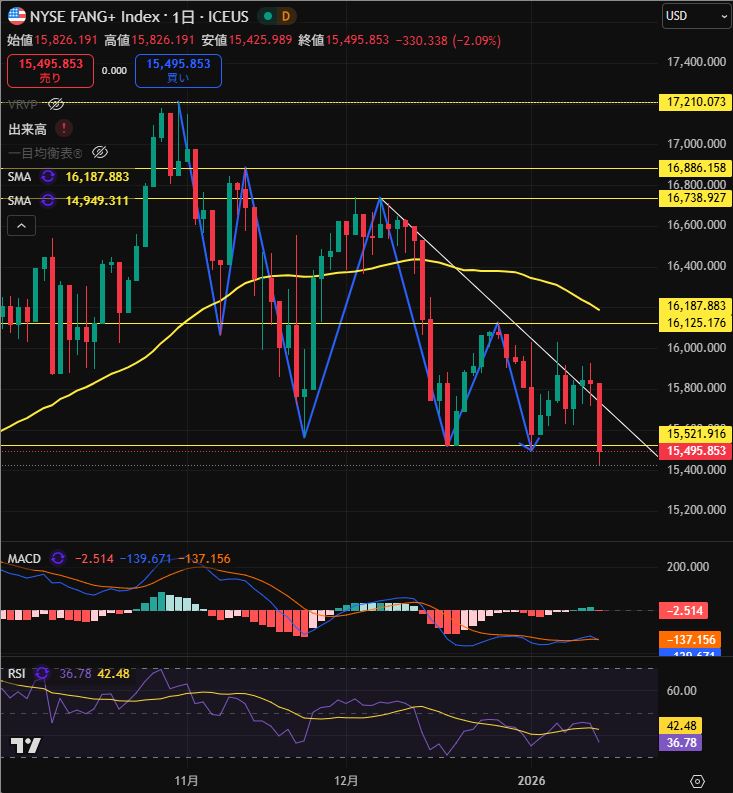 そして、その要因であるFANG+は、下値を切り下げて下落しています。