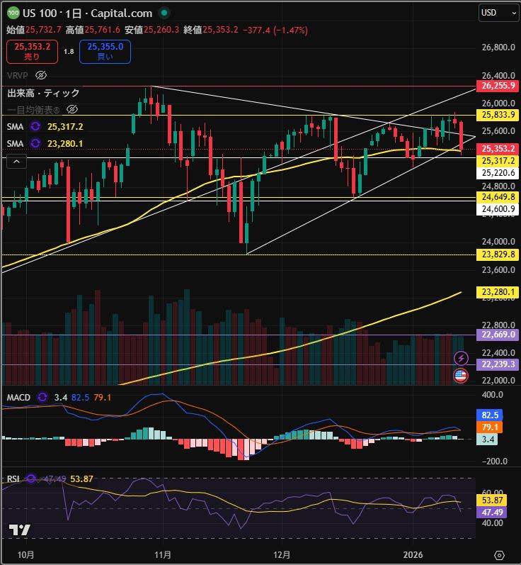 NASDAQ100は、50日移動平均線にかろうじて支えられている感じです。