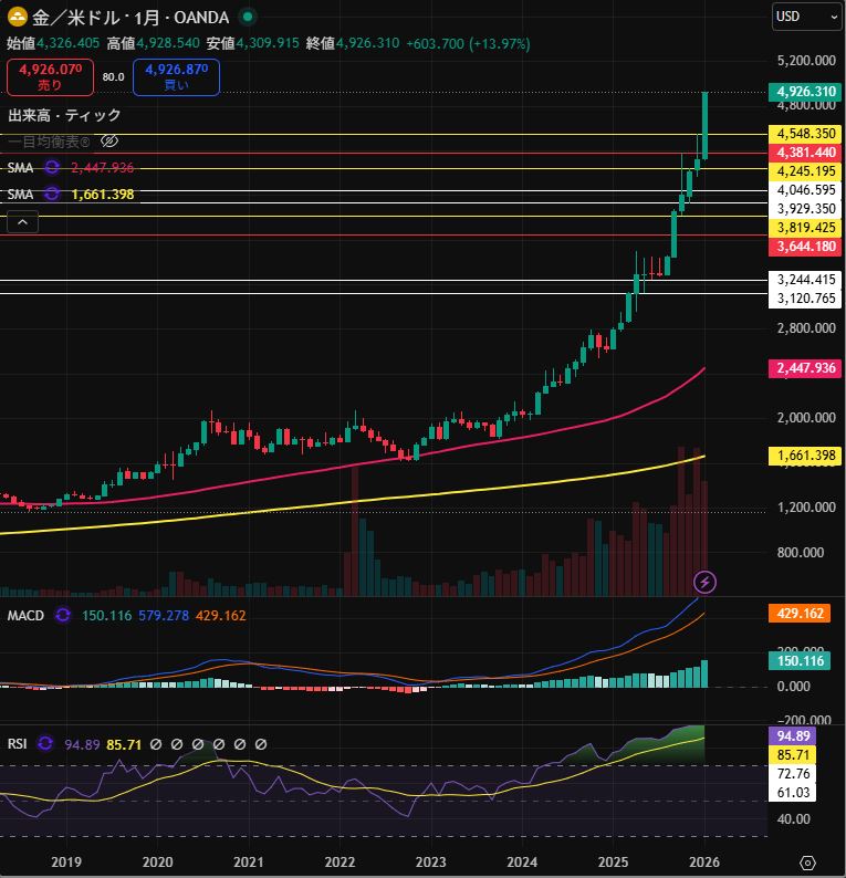 こちらが、金(ゴールド)の月足チャートです。