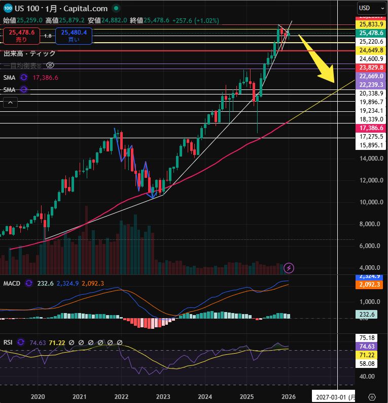 そして、こちらがNASDAQ100の月足チャートです。