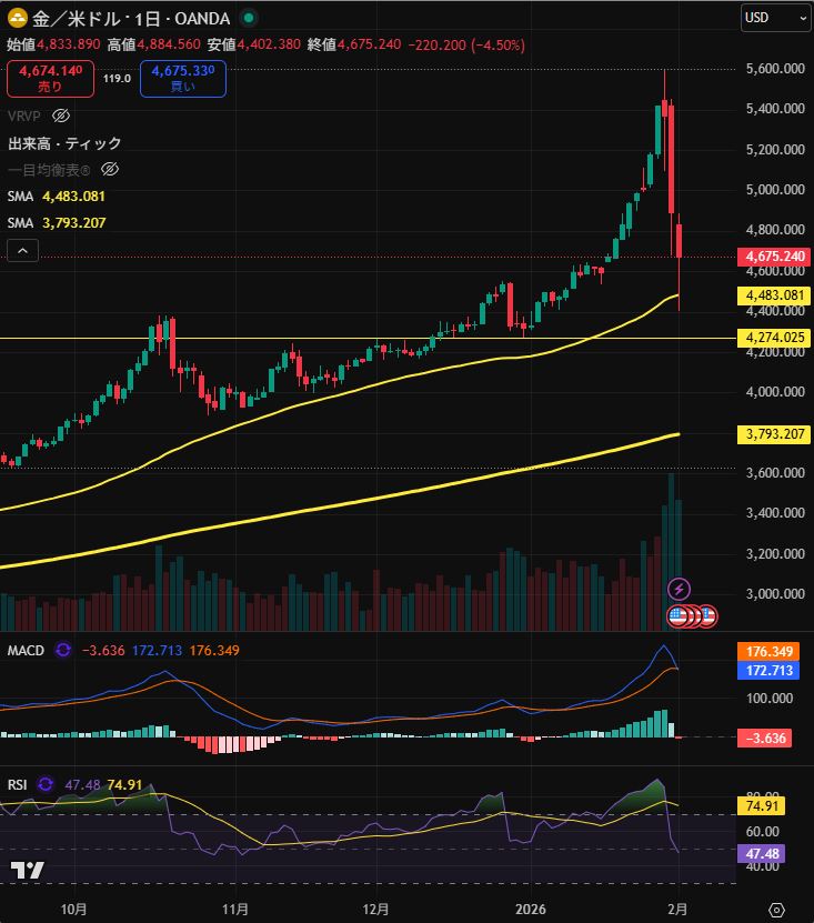 次期FRB議長候補の発表を受けて市場は「タカ派に傾く」との見方に変わり、利下げ期待が後退したことから 、これまでの金(ゴールド)の上昇を正当化できなくなったことで利益確定売りが発生。