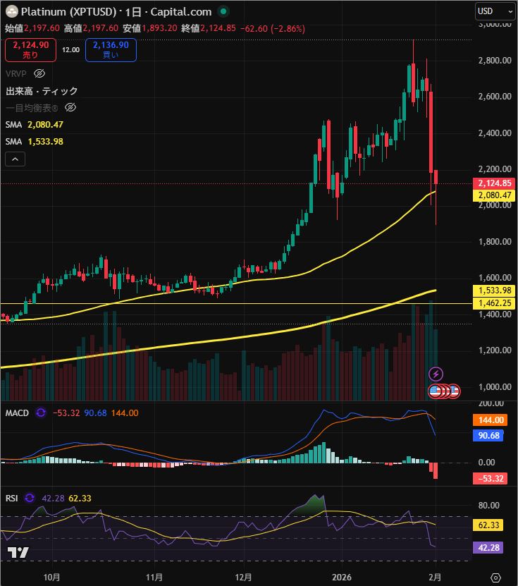 プラチナは、最高値からマイナス約35%下落したのちに、買い戻されています。