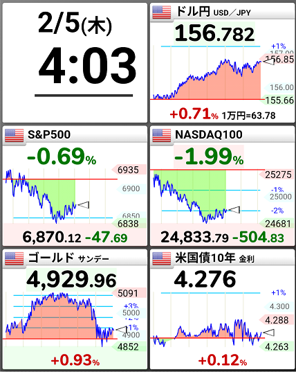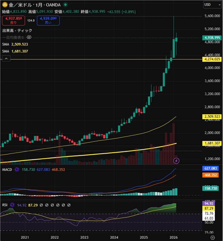 暴落した金(ゴールド)が反発上昇して$5,000付近での攻防が続いてますね。
