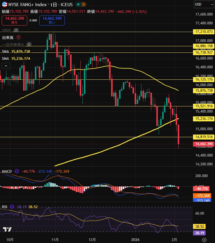 こちらは下落トレンド継続中で、明確に200日移動平均線を割り込んでいます。