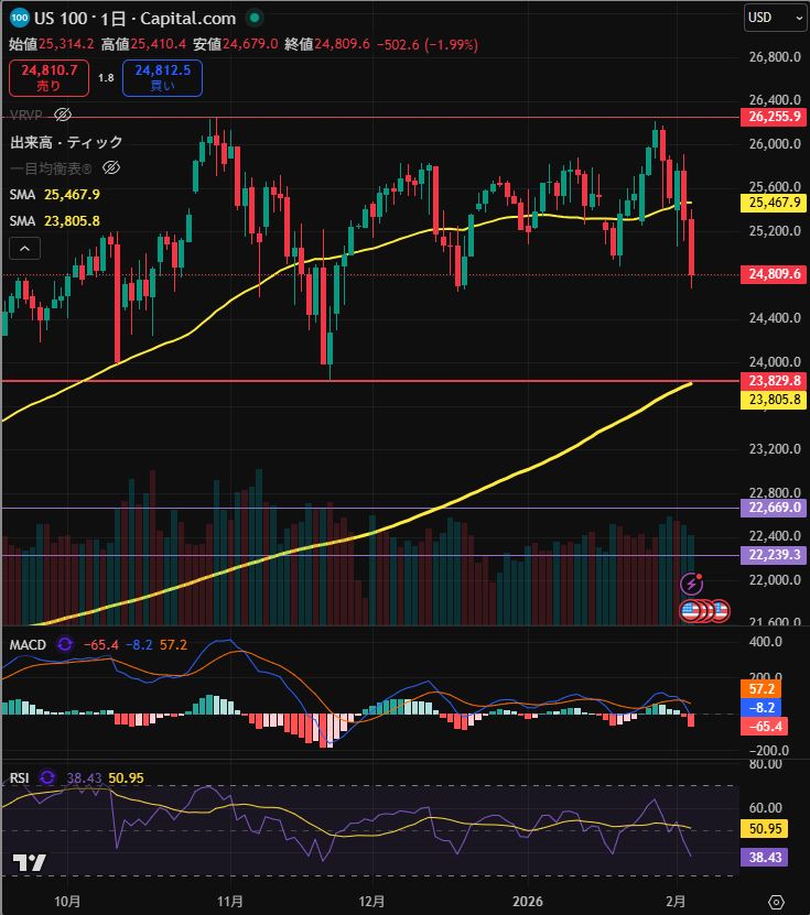 一方、NASDAQ100はレンジ相場で行ったり来たり、方向感に欠けています。