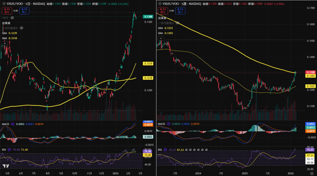 明るい情報といえば、VXUS(全世界株式除く米国)をVOO(S&P500)で割って求めた合成指数(画像左側の日足チャート)が、ゴールデンクロスして以降大きく上昇し、ついに週足チャート(画像右側)でも200周移動平均線を上抜けました。