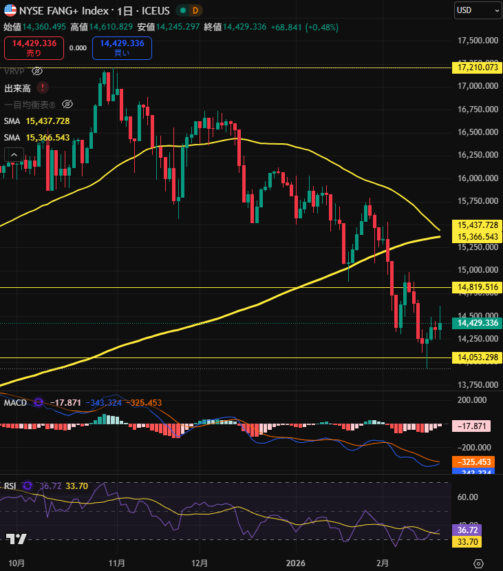 一方、FANG+は売り圧力が強く、押し戻されている感じです。
