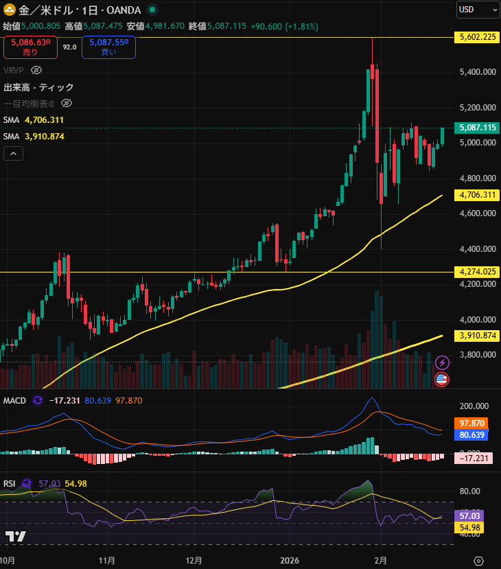金(ゴールド)は、上に抜けたがっている様相ですね。