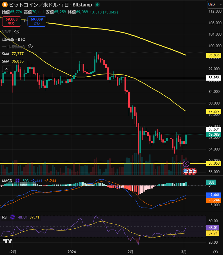 ビットコインの上昇はリスクオンを意味することが多いので、市場参加者は楽観的になっていると捉えるのが本来自然な見方ですが、何とも微妙なのではないでしょうか。