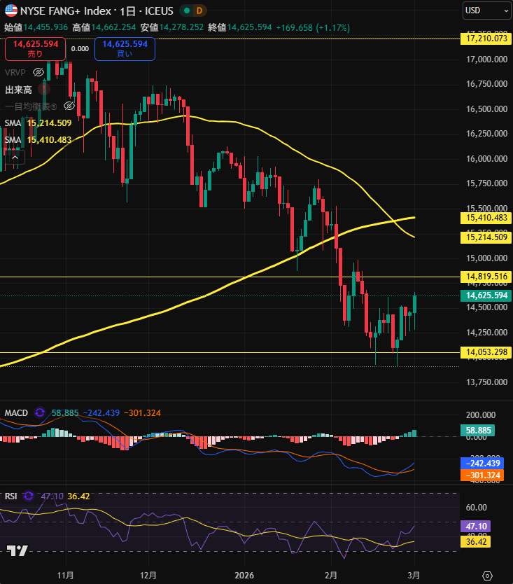 そして、株式のFANG+を見ると一旦は売られたものの、現在はやや上昇しています。