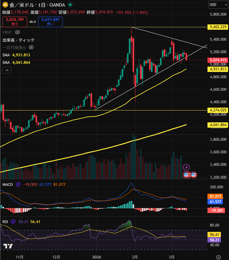 相場の動向で気になるのは、金(ゴールド)が三角持ち合いを下にブレイクしたことです。