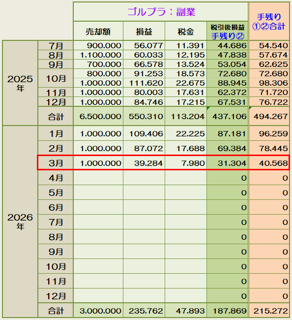 副業:ゴルプラ錬金術の方は、3月16日の記事【副業:ゴルプラ錬金術10回目の確定損益】でご報告の通りですが、上記ゴルナス分を加算すると下図の通りです。