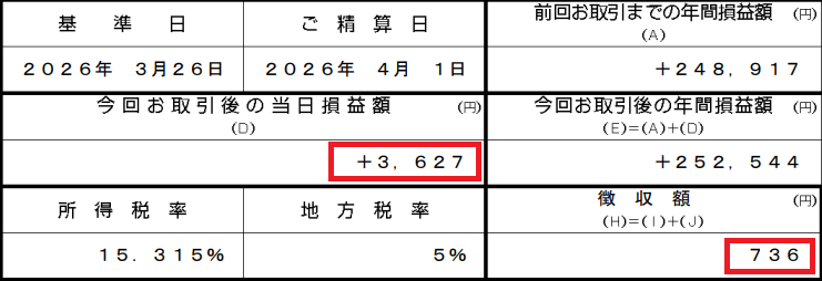 売却した1万円のうち利益が3,627円で、前月よりも利益が減った分、税金も減ってます。