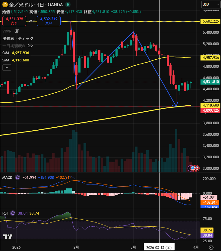 そして、金(ゴールド)も50日移動平均線までズルズルと下落しているタイミングでした。