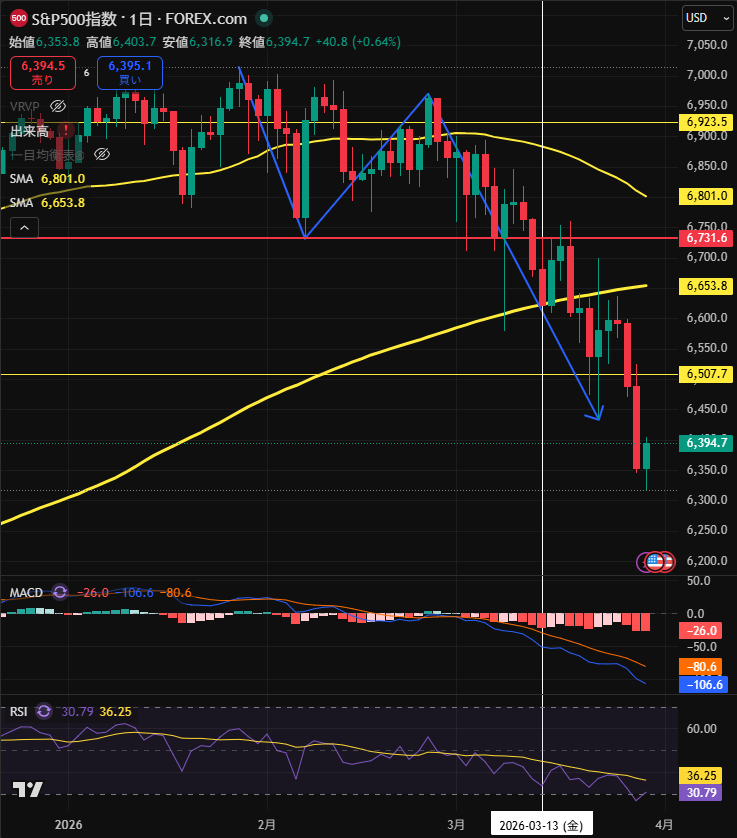 この時S&P500は一貫して弱く、戻り高値と言うよりは僅かに反発しただけで、ズルズルと200日移動平均線まで落ちてきていました。(今では、更に大きく下落しています。)