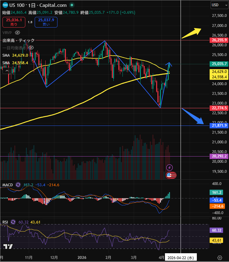 NASDAQ100の方向感は全く見えてきませんが、いよいよデッドクロスしそうです。