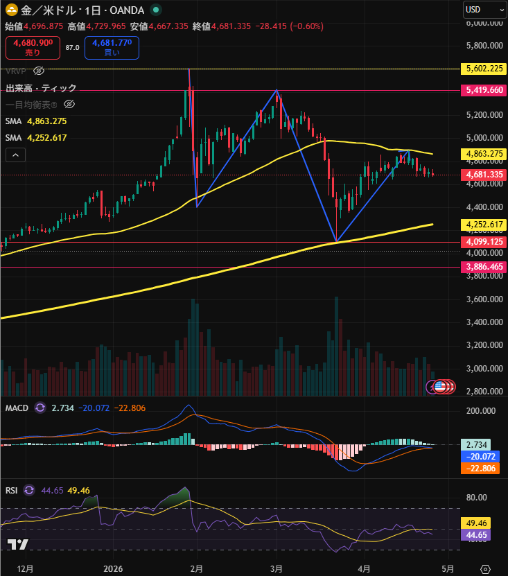 残念ながら金(ゴールド)の調整局面は継続していますので、もう少し日柄(冷却期間)が必要ですね。
