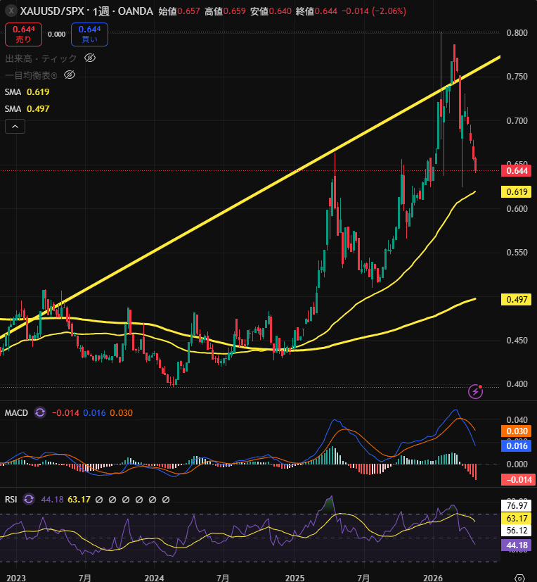こちらの週足チャートは、金(ゴールド)をS&P500で割った合成指数で、S&P500に対して金(ゴールド)がずいぶん安くなってきています。