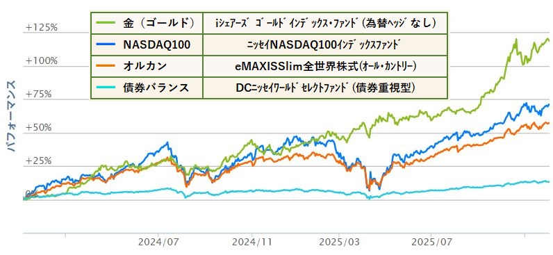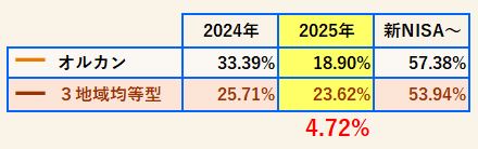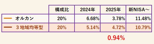 2025年、米国比率が65%もあるオルカンが、3地域均等型に4.72%もリターンで劣後しています。