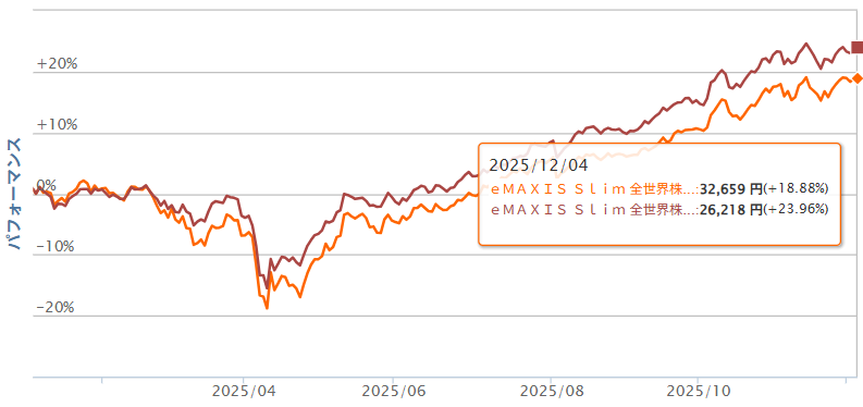 こちらの、オルカンと3地域均等型のチャート比較では、僅かですが差が広がっていってるように見受けられます。