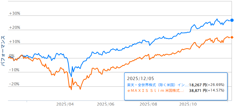 今年は、ダブルスコアに近い差で米国株式S&P500が劣後して、全世界株式(除く米国)が圧勝していることが分かります。