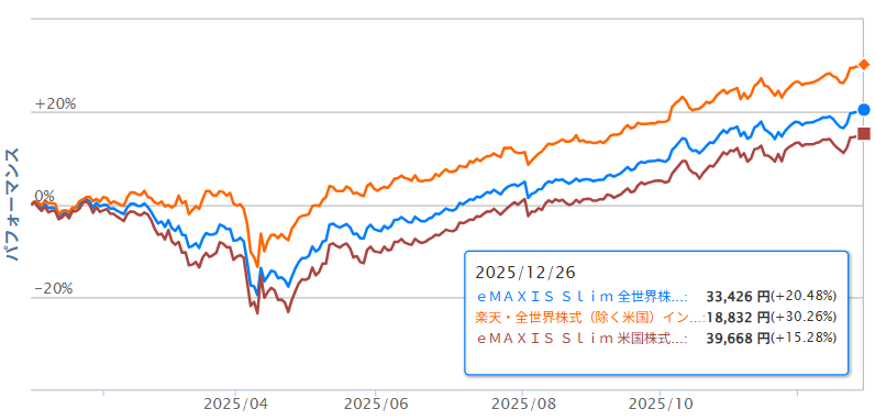 下から順に茶色が米国S&P500、青色がオルカン、オレンジ色がオルカン(除く米国)で2025年の年初来パフォーマンスのチャートです。