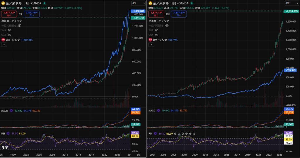 こちらの図は、左が1996年以降(前述の中央銀行の保有比率転換点)、右が2000年以降(ITバブルの天井圏)の金(ゴールド)とS&P500指数の円建てチャート(月足)です。