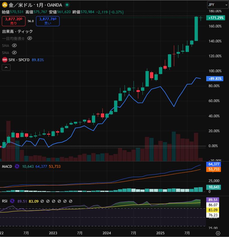 ※ローソク足が金(ゴールド)、青色の折れ線がS&P500指数です。