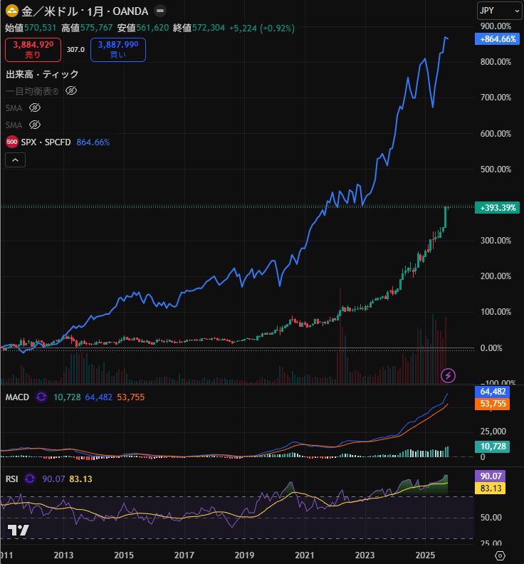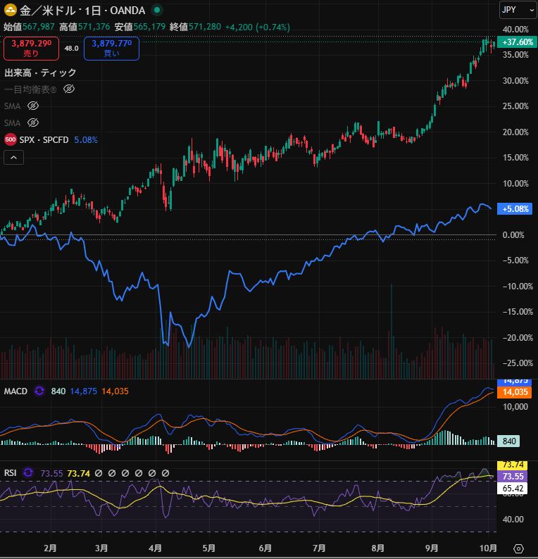 S&P500指数が約5%の上昇に対して、金(ゴールド)は約37%の上昇です。
