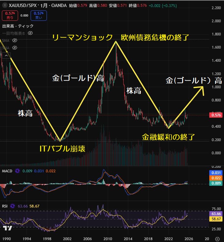 金(ゴールド)とS&P500指数の大きなトレンドの変化(黄色の折れ線)がご理解頂けましたでしょうか?