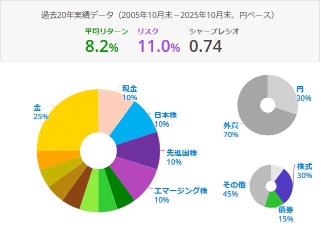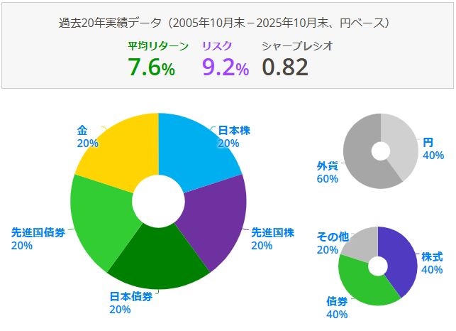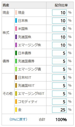 4資産均等型よりはシャープレシオ(投資効率)が下がってしまいますが、リターンに少し余裕がでます。